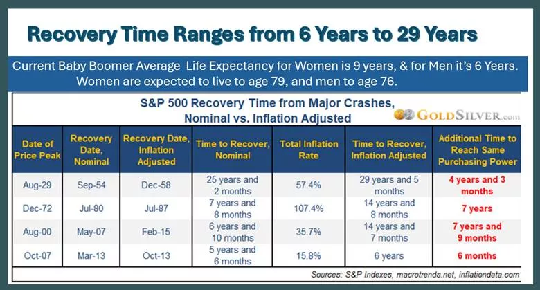 Our 75 million baby boomers are currently spending this decade in the Retirement Risk Zone during which investment losses can ruin the rest of life. But the threat of suffering diminished lifestyles, and possibly outliving savings, is being shrugged off because according to Investopedia the average full recovery time (from the peak back to the prior high, including the decline and subsequent rebound) is roughly 2 years, so no problem. The average crash is easily survived.