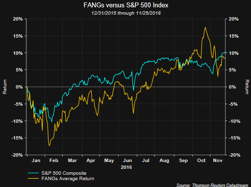 Given the strength of the FANGs return in the couple of years leading up to the end of 2015, the fact they have kept pace with the market in 2016 is somewhat a sign of investors continued interest this group of stocks.