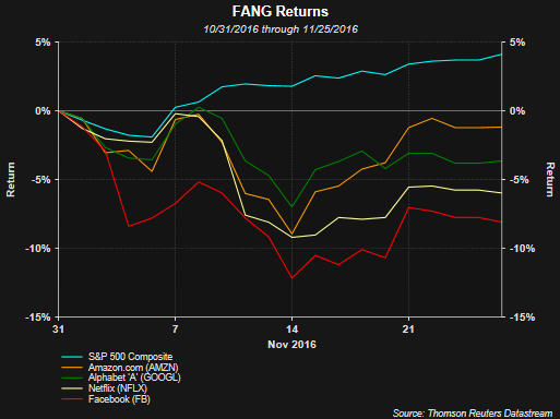 Back to the change in stock leadership that is underway this month, the FANGs have not been immune to weakness relative to the broader market. The rotation that has occurred since the election is seeing flows into value/cyclically oriented stocks versus growth stocks that tend to trade at a higher price earnings ratio or valuation multiple. Each of the four FANG stocks are underperforming in November and is this indicative of the beginning of a longer term trend?
