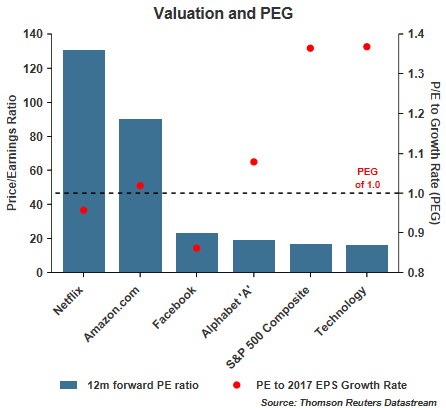 The importance of comparing PEGs across different stocks or sectors is the PEG enables an investor to uncover stocks that may trade at relatively high P/Es because the company's earnings are expected to grow at a faster rate than maybe a lower P/E stock. As can be seen in the below chart, the FANGs' PEG ratio is lower than that of the broader S&P 500 Index and the technology sector itself.