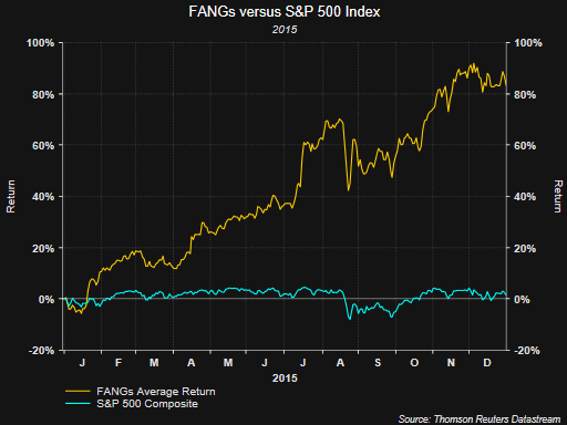 One area of technology that generated out sized returns in 2015 was related to internet and social media companies. The favored group of stocks called the FANGs (Facebook (FB), Amazon.com (AMZN), Netflix (NFLX) and Google/Alphabet (GOOGL) were a beneficiary. The below chart shows the significance of the 2015 FANG returns.