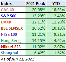 All eight indexes on our world watch list posted gains through June 28, 2021. The top performer is France's CAC 40 with a gain of 18.3%, our own S&P 500 is in second is with a gain of 14.2% and Germany's DAX is in third with a gain of 10.9%. Coming in last is China's Shanghai with a gain of 3.8%.