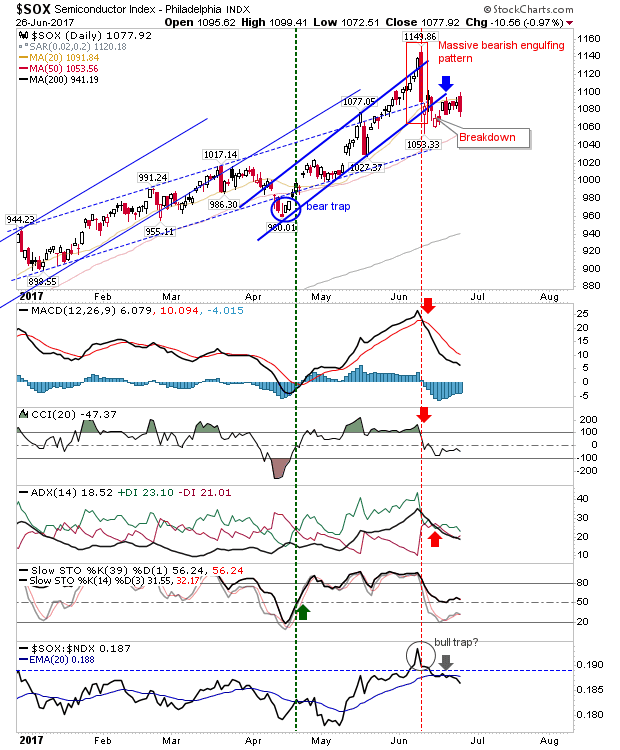 The index which has set up for shorts yesterday played to form today. The Semiconductor Index offered a decent gap high short entry point this morning before reversing hard into a significant bearish engulfing pattern. Even tentative shorts may find enough to hold on for a test of the 50-day MA.