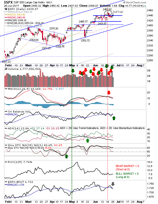 The S&P attempted to challenge its 'bull trap' but found itself finishing with a spike-high-bear-black-candlestick. This index looks more vulnerable to a series loss with support not likely to kick in until the 50-day MA at 2,403 is tested. There was some consolation with a new On-Balance-Volume 'buy' trigger but this is unlikely to last if there is another day of selling.