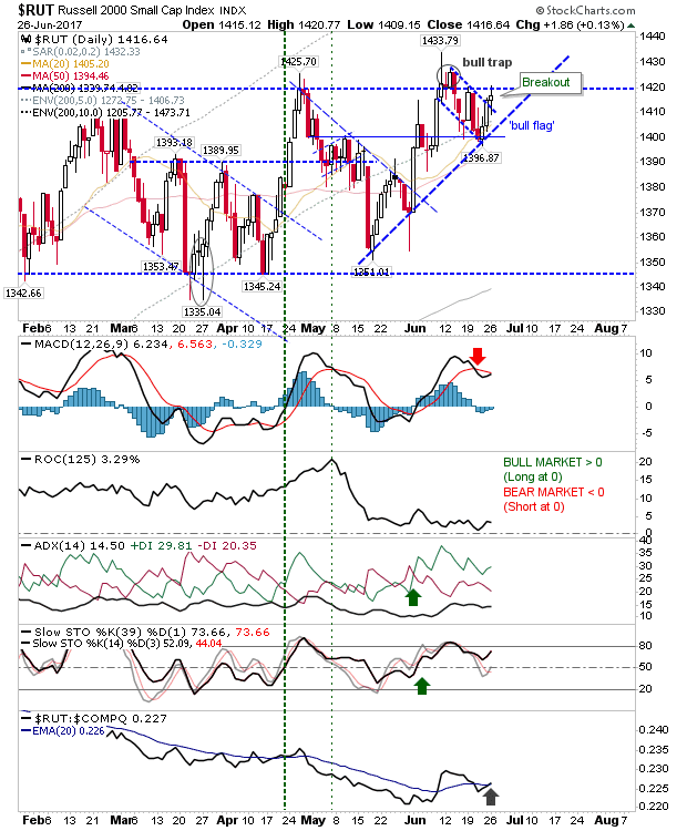 The one exception was the Russell 2000. While it wasn't able to hold the early gains it did do enough to register a breakout from the 'bull flag'. Bulls may have had a rough day but the Russell 2000 continues to deliver under the cover of its horizontal trading range.