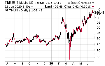 T-Mobile has said its early version of 5G is now available nationwide in the U.S. The company is currently working on rolling out a mid- and high-band network, to get to true 5G. Since closing the merger, the combined T-Mobile has marched steadily higher, now trading at just under $105.