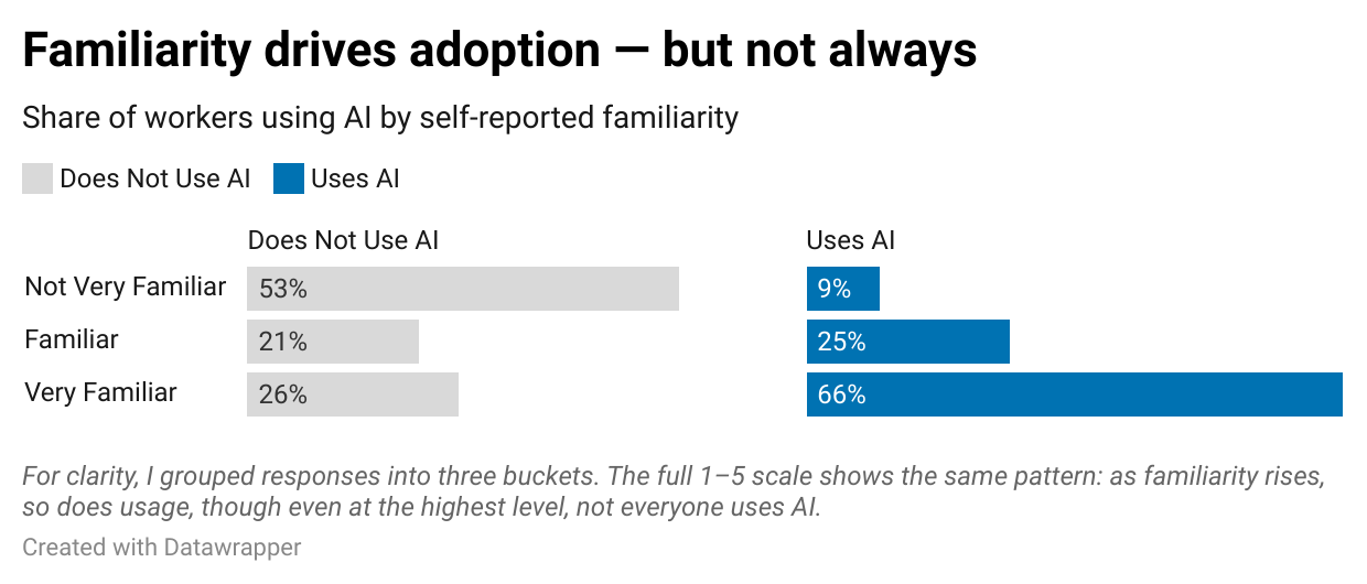 Familiarity vs usage: 85% are familiar, but even among the very familiar, more than a quarter don’t use AI at all.