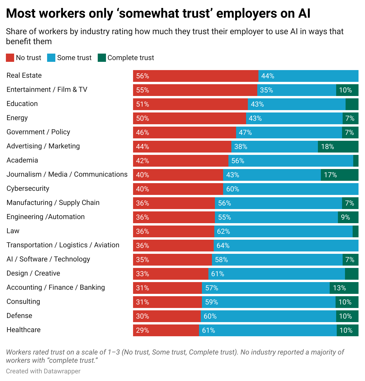 Trust paradox: Most people “somewhat trust” their employers on AI. But in many industries, a majority report no trust. No industry reached a majority “complete trust.”