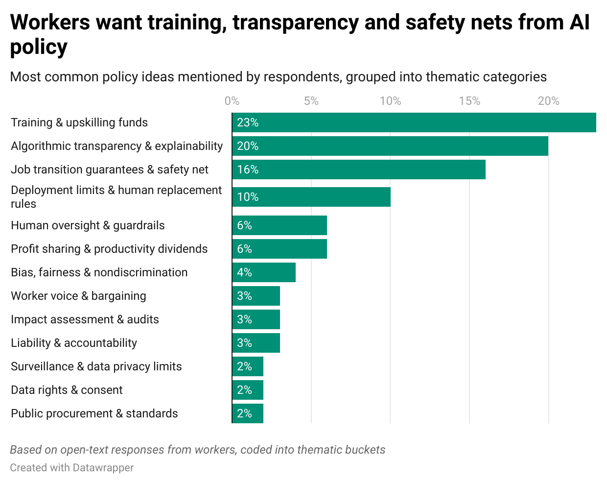Policy demands: The most common requests were: training/upskilling funds, algorithmic transparency, and safety nets for displaced workers.