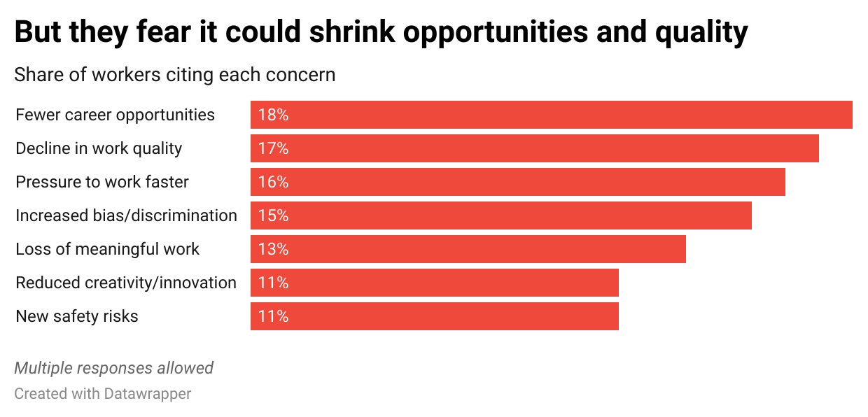 But those same workers are also worried about fewer career opportunities and a decline in work quality. In other words: even as they want AI to take over the drudge work, they fear it could take away the parts of their work that matter most for advancement and identity.