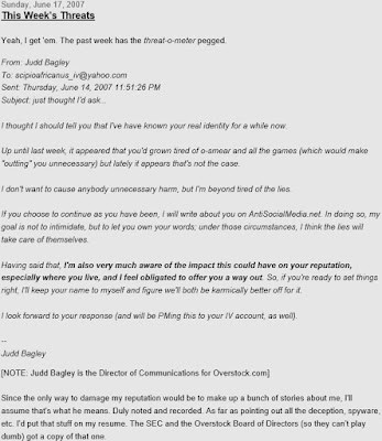 In February 2009, I exposed violations of accounting rules by Overstock.com that allowed it to fabricate a Q4 2008 profit rather than properly report a loss in that quarter and overstate its reported income in later quarters. Byrne retaliated by personally attacking me on a stock market chat board, during various earnings calls, and in the press, in an effort to discredit me. During that time, Judd Bagley injected himself into my divorce proceedings by contacting my former spouse, who ignored him.