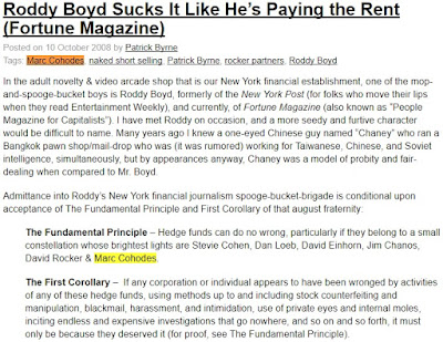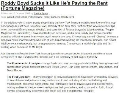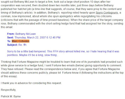 This kind of cynical behavior is amoral and insulting to Byrne’s numerous targets, including myself, his ex-partner David Rocker, other short-sellers, bloggers, analysts, and journalists like Carol Remond, Joe Nocera, Herb Greenberg, Gary Weiss, Roddy Boyd and Bethany McLean, all of whom are currently under attack on Deep Capture.