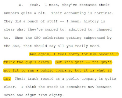 Cohodes has said that he “bets the jockey, not the horse.” Until recently he viewed Byrne as a crazy fool. During deposition testimony in a lawsuit between Overstock and Goldman Sachs, Cohodes described Byrne as a nut who was not fit to run a public company (click on image below to enlarge).