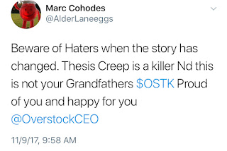 Here is a typical recent Cohodes tweet pumping Overstock, slobbering over Byrne, disparaging his victims as “haters,” and hyping a new Overstock that suddenly materialized after he took a position in the stock.