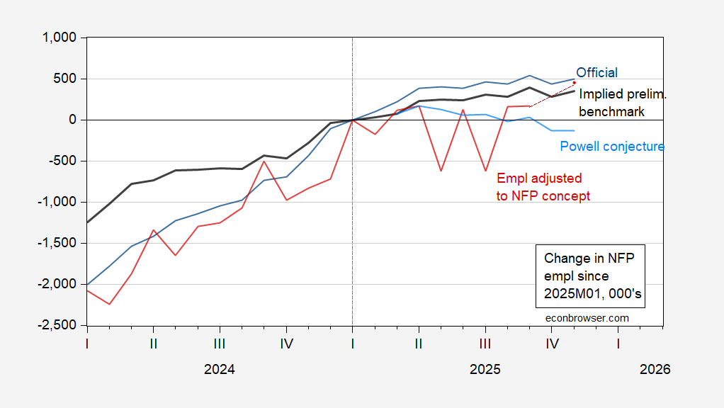 Figure 1: Official CES nonfarm payroll employment (blue), implied benchmark revision (bold black), Powell conjecture based on implied benchmark revision (sky blue), and CPS employment adjusted to NFP concept, smoothed population controls (red), change since January 2025, in 000’s. Source: BLS via FRED, BLS, and author’s calculations.