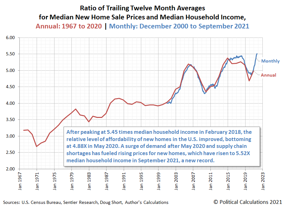 Elsewhere, TM contributor Ironman takes note that (putting discussions of inflation being transitory or persistent, aside) New Home Affordability Weakens In September 2021 and "(Through September 2021), the median new home sale price in the United States rose to cost 5.52 times the median household income, setting a new record for this measure."