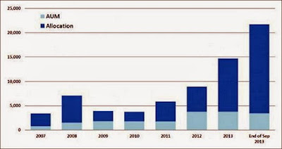 Our last chart today is from Balyasny Asset Management’s third quarter 2013 letter to investors via the Zero Hedge blog. It shows the firm’s amount of assets under management (light blue) and how much purchasing power the firm has used (dark blue):