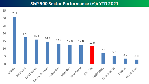 Despite the tumultuous headlines and market volatility along with the frustrating churn in the market lately, US equities are finishing off the quarter well. Stocks in the S&P 500 are up an average of 11.9% so far this year and grouped by sector they’re all averaging gains. Leading the way higher, stocks in the Energy sector stand apart from every other sector with an average gain of over 20%. After Energy, stocks in the Financials and Consumer Discretionary sectors are both up an average of over 15%.On the other side of the chart, sectors underperforming are generally defensive in nature with Health Care and Utilities both averaging YTD gains of less than 5%. One notable underperforming sector given its size is Technology. With an average gain of 7.2% YTD, stocks in the Technology sector are underperforming the broader market by more than 4.5 percentage points.