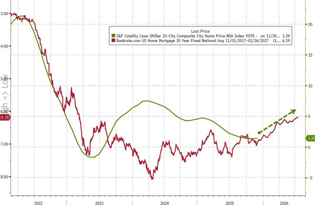 For the fourth straight month, US home prices rose on a MoM basis in November (according to the admittedly lagged and smoothed Case-Shiller data released today). The 0.47% MoM rise is the hottest since Dec 2024
