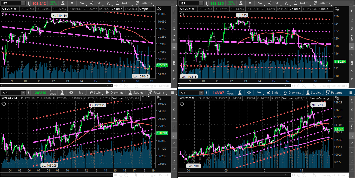 Under the latter scenario, I'd expect money to rotate into bonds (which has already been the case over the past several months, as shown on the following monthly charts of 2/5/10/30-year bonds) and/or cash (U.S. $).