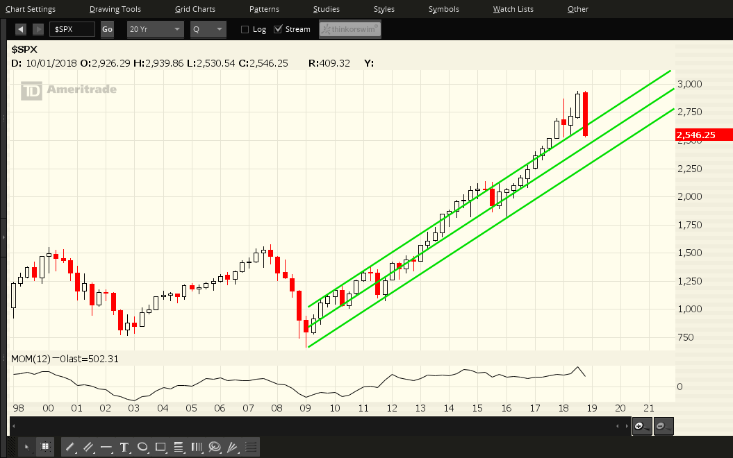 Each candle on the following three charts of the SPX represents a period of one month, one quarter, and one year, respectively.