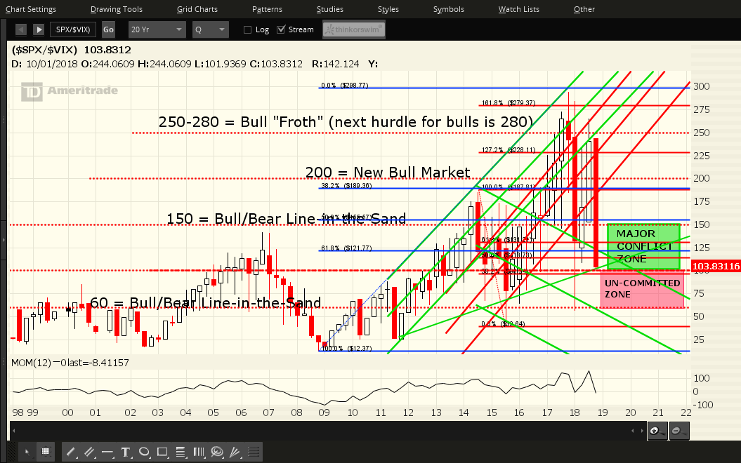 Each candle on the following three ratio charts of the SPX:VIX ratio represents a period of one month, one quarter, and one year, respectively.