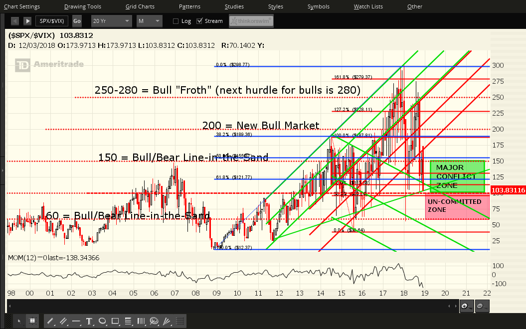 Depending on where both the SPX and SPX:VIX Ratio close at the end of December, I anticipate, either a slower level of equity accumulation, if there is much, to, potentially, propel the SPX to retest its prior all-time high of 2940.91, or to resume further declines, putting the SPX at 2400, or lower, as I've repeatedly mentioned since August and as I last described here. In fact, 2250 would be the next major support below that level, followed by 2000, as is evident on the above three charts of the SPX.