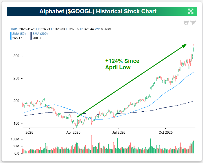 2025 has turned into the Year of Alphabet (GOOGL). It is now the best performer of the mega-caps with a 70% year-to-date gain, and it has more than doubled (+124%) since its April low. Check out the near-parabolic move that GOOGL shares have seen just in the last couple of months.