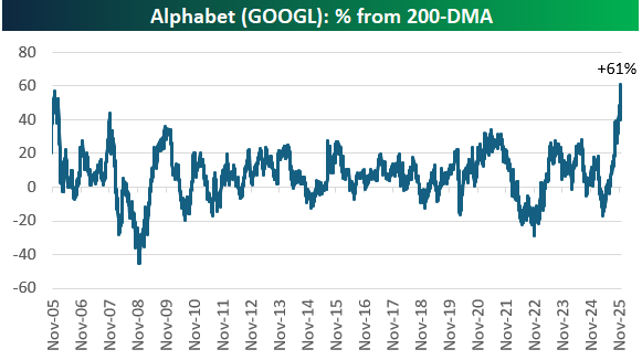 Of course, a move higher of this magnitude leaves shares extremely elevated relative to moving averages. As of yesterday, GOOGL shares were a record 61% above their 200-day moving average.