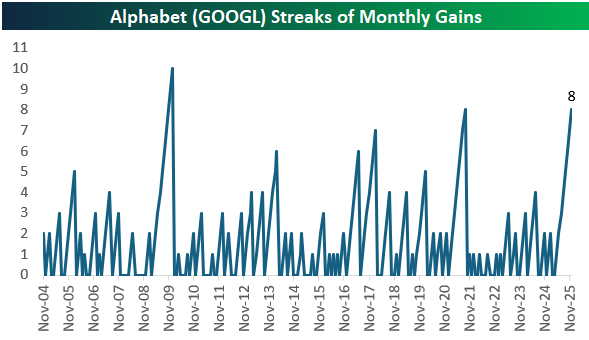 While Alphabet has recently spiked because of rave reviews for its latest LLM model (Gemini 3), GOOGL shares have actually risen for eight straight months: