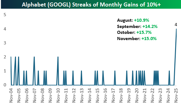Even more remarkable is that GOOGL shares have gained more than 10% for four consecutive months, which is easily a record since it went public in 2004. (This presumes shares don't collapse on the final trading day of November on Friday.)