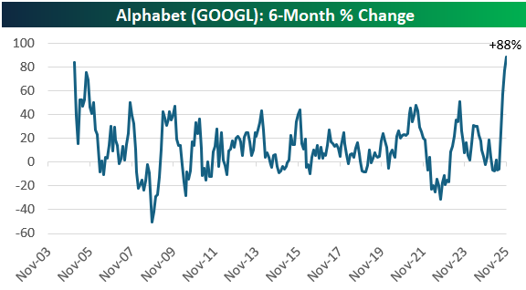 As shown below, GOOGL's 88% gain over the last six months is its strongest six-month move in its history! An 88% move over six months is impressive for a company of any size, but it's even more astounding for a company with a $3.8 trillion market cap.