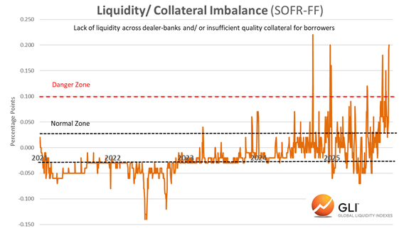 As I’ve noted, the Fed Funds rate isn’t what matters in a world of leverage, liquidity, and crowding. The Secured Overnight Financing Rate (SOFR) is, and when it gets detached from the Fed Funds rate, problems start. This chart from Michael Howell showcases that we are in the danger zone: