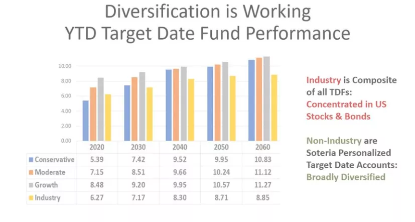 Because US stocks are lagging, diversification has “worked.” Investments in other assets have benefited performance, as can be seen in the performance of target date funds (TDFs). In the past decade, until now, diversification did not work because US stocks dominated.