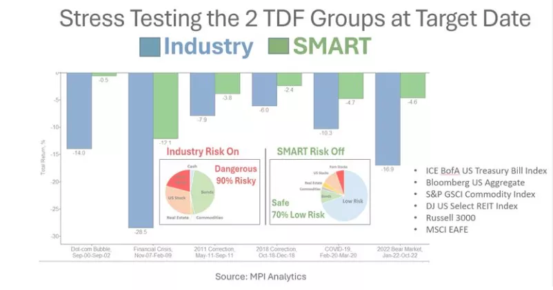 The concentration of TDFs in US stocks and bonds is a bet that has generally paid off, but a stress test reveals the exposure. The next crash of the US stock market will devastate, especially our 75 million baby boomers because they are in the retirement risk zone. There are two distinct groups of TDFs – Safe and Risky. Risky (“Industry” in the image below) has generally won, but Safe (“SMART”) will shine in the next crash, as it has in previous market downturns.