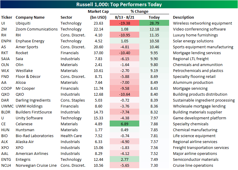 In the table below, we show the 25 best performing stocks in the Russell 1,000 today. As shown, wireless networking equipment maker Ubiquiti (UI) is experiencing the single largest gain of any stock in the index, up 28.8%. The stock's surge comes after reporting a top and bottom line beat this morning with the announcement of a stock buyback and cash dividend. Earnings aside, the stock was a big decliner in the days prior, having fallen almost 20% since August 13. The next largest gain was another earnings story as Zoom Communications (ZM) rose 12.18% on its own top and bottom line beat.