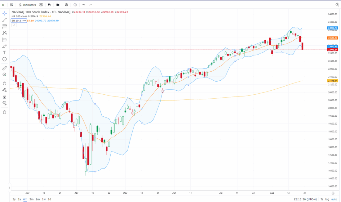 NDX, 6-Month Candles, with 2 STD, 10-day Bollinger bands (blue) and 100-day Moving Average (orange)