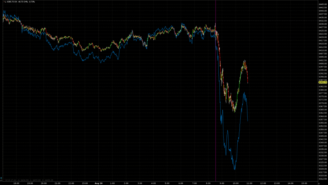 1-Day, Since 5PM CDT: ES (green/red candles) and NQ (blue line) September Futures, with vertical line at 7:32 CDT (8:32 EDT)