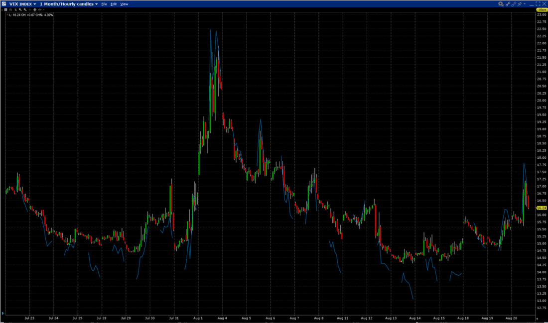 1-Month VIX (red/green hourly candles), VIX9D (blue discontinuous line)