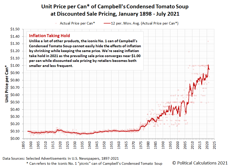 In 2021, the price of Campbell's Condensed Tomato Soup is converging near a shelf price of $1.00 per 10.75 ounce can. In July 2021, the trailing twelve month average discounted sale price is $0.95 per can, which has fallen from a seasonal peak of $0.99 per can in December 2020 thanks largely to some unique pandemic-driven supply and demand dynamics. We think we'll start seeing higher retail shelf prices in the very near future to confirm the permanence of 2021's inflation.
