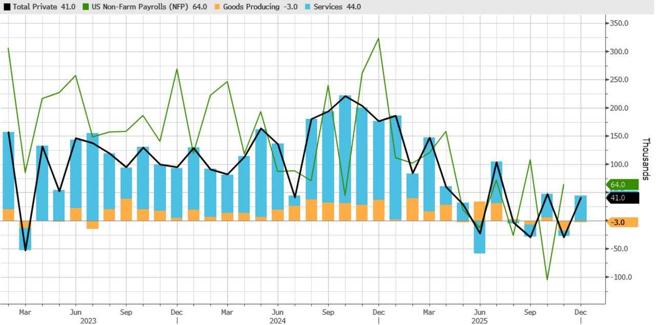 One month after ADP reported a dismal -29K private payrolls print for November, tied for the worst month since March 2023, and just in time to validate the Fed's latest rate cut, moments ago ADP reported that in December, the US added 41K payrolls, which while a solid jump from last month's -29K, missed consensus estimates of a +50K print.