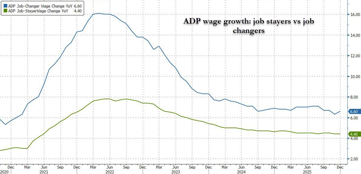 There was more good news for the Trump admin which appears to have halted the sharp deterioration in the labor market: year-over-year pay for job-stayers rose 4.4% in December, unchanged from November while jobchangers saw their pay growth accelerate to 6.6% from 6.3%.