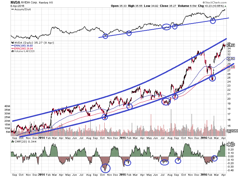 At first glance, it would seem to be all out of control to the upside. If you're going to buy it, you have to wait for a big pullback, right? But if you assume there is a change in climb steepness, related to some fundamental changes in their business, and you construct the trading channel change in slope associated with that, you see that it doesn't look so overbought. It is, in fact, resting on the bottom of the new channel preparing for the next run to the top.