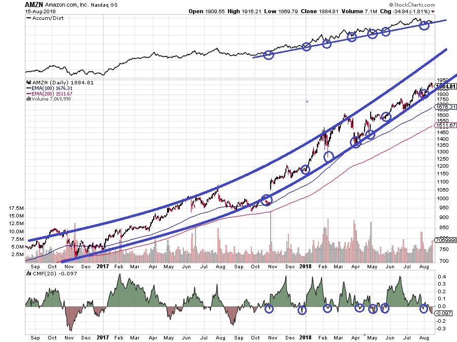 Here we have the same A/D cycling setting in with the same change in channel. And what happened? Well, we all know what happened. This turned out to be the massive breakout NVDA did in 2015, and it made a bee line to $250 from the way "overbought" $35 price you see at the right end of this chart. Just staring at the above chart in April of 2016, your thought was that you'd have to be crazy reckless to buy it there. But the combined wisdom of the market was telling us that Nvidia's business was changing from gaming to artificial intelligence and a bunch of new, lucrative stuff. I suspect something similar may be going on now with Amazon.