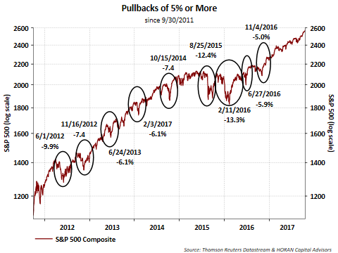 Admittedly, in an equity market run investors are currently experiencing, i.e., the second longest run without a 20% pullback, a common theme that continues to seep into ones thinking, including mine, is when is the market going to experience a bear market correction of 20% or more. Even a double digit pullback is a scarcity as the below chart of the S&P 500 Index shows. The last double digit pullback occurred in February of 2016.