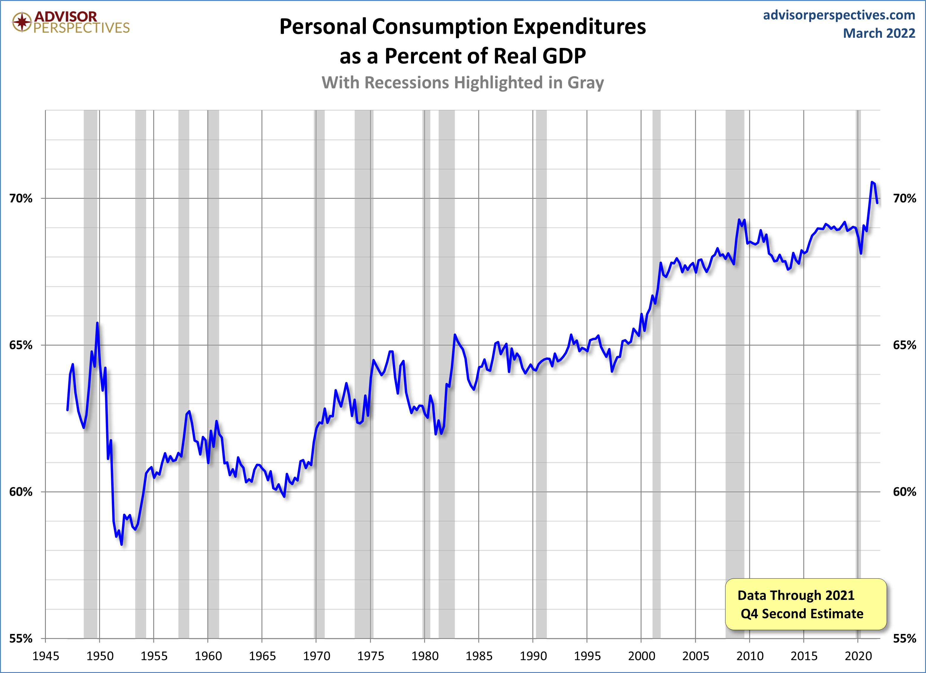 As for the role of Personal Consumption Expenditures (PCE) in GDP and how it has increased over time, here is a snapshot of the PCE-to-GDP ratio since the inception of quarterly GDP in 1947. To one decimal place, the latest ratio of 69.9% is below its record high.
