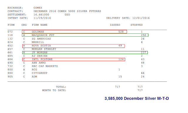 As for silver, the big deliverers of the December contract positions were customers at Goldman and Intl FCStone, and a smaller amount from the house account at Nova Scotia.