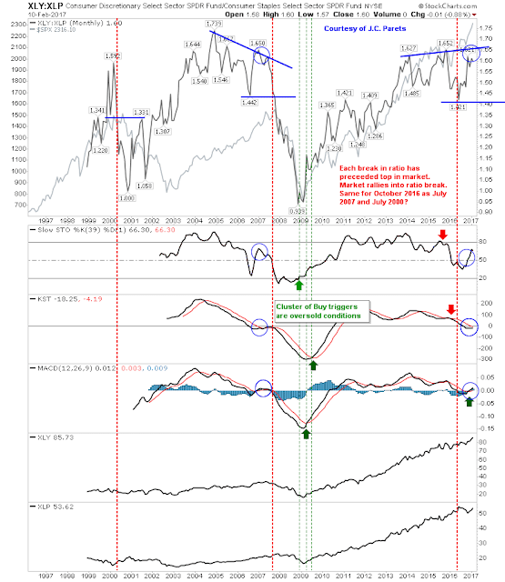 Breadth metrics have recovered enough to suggest there is still more upside. The relationship between Consumer Staples and Discretionary ETFs suggest there is room to run before getting to tag resistance at 1.65.