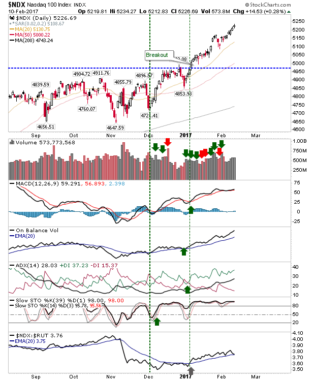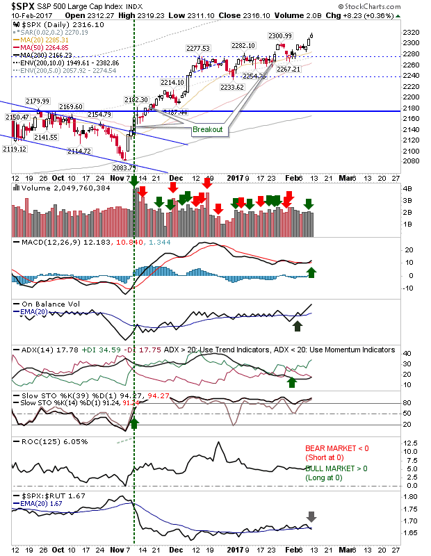 The S&P and Dow Industrials managed new closing highs; albeit on light enough volume and with relative under-performance against the Russell 2000. Having said that, On-Balance-Volume has consistently climbed higher, while the MACD generated a fresh 'buy' trigger above the bullish zero line. Slow-and-steady may win the race here.