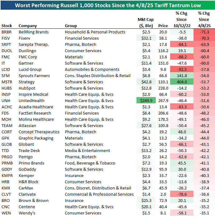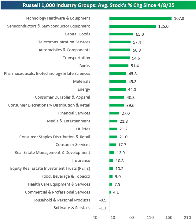 The average stock in the Russell 1,000 is still up roughly 37% since the April 8th tariff-tantrum low, but performance across industry groups has been eye-opening.